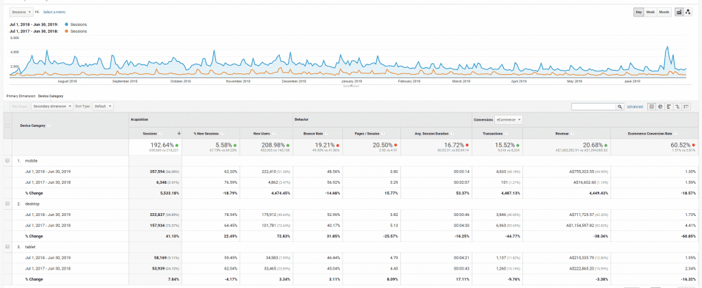 This PrestaShop retailer took our advice and changed their website to be more mobile-focused. The investment paid off. Their Mobile traffic went from 3% in 2018 to 56% in 2019, and revenue coming from users on mobile devices increased a dramatic 4,449%!