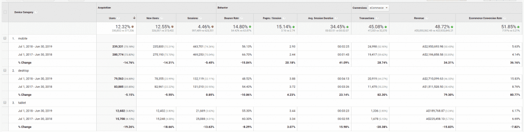 When reviewing Google Analytics and looking for ways to improve eCommerce conversion rates, it pays to look at how users interact with your website on different desktop, tablet and mobile devices. Mobile is SO important these days. When you look at Analytics data and see the numbers of visitors on mobile devices, it may surprise you.