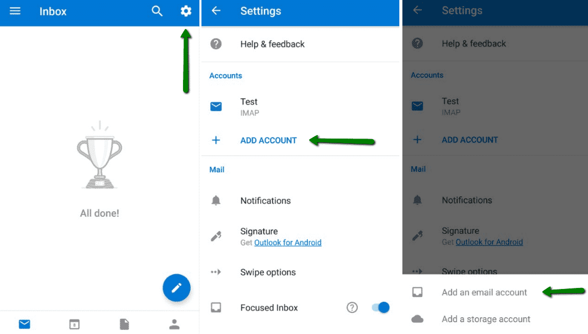 3. If you already have an email account added to Outlook, press Settings in the upper right corner, select Add Account, then Add an email account:
