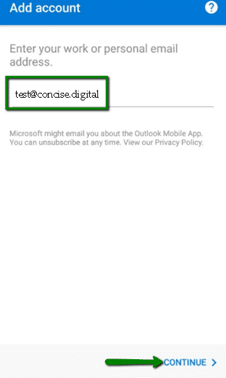3. Type the full email address of the account you want to add (we use [email protected] as an example) and press Continue: