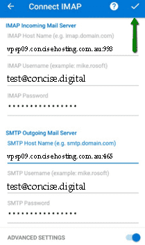 – IMAP Host Name: ‘the name of the server your account is hosted on’:993 (e.g. vpsp09.concisehosting.com.au:993) for SSL (or ‘the name of the server your account is hosted on’:143 for TLS/STARTTLS);