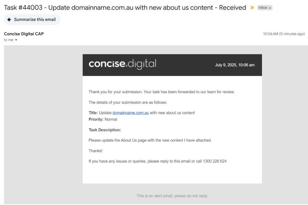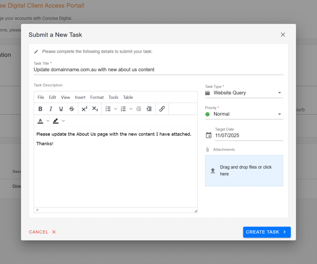 1. “Website Query” – tasks related to your Website, if we look after multiple websites, include the domainname.com.au so we know which website