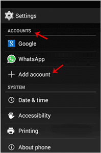 1. Open your android mobile, go to the main menu and the “Settings” options, and under the “Accounts” option, tap on “+ Add Account“.