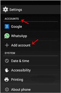 1. Open your android mobile, go to the main menu and the “Settings” options, and under the “Accounts” option, tap on “+ Add Account“.