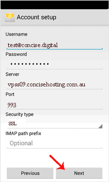 5. Make sure you are using your domain name in the server field, for example “example.com”, and the port should be set to 993 with SSL enabled. Then tap on the “Next” button. (Leave all other options as they are.)