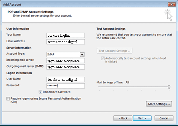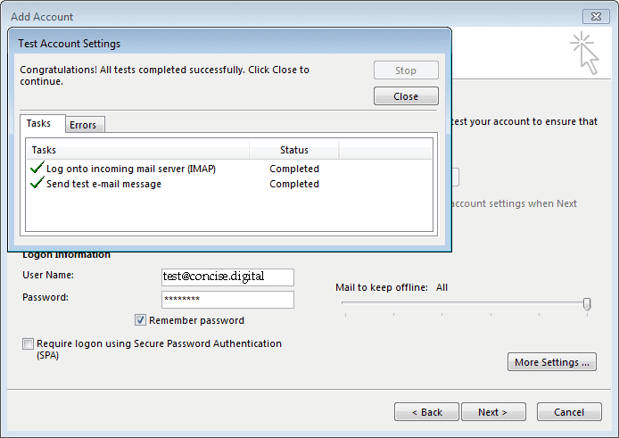 9. Once all is done, click OK to close the window and then Next to test server connection: