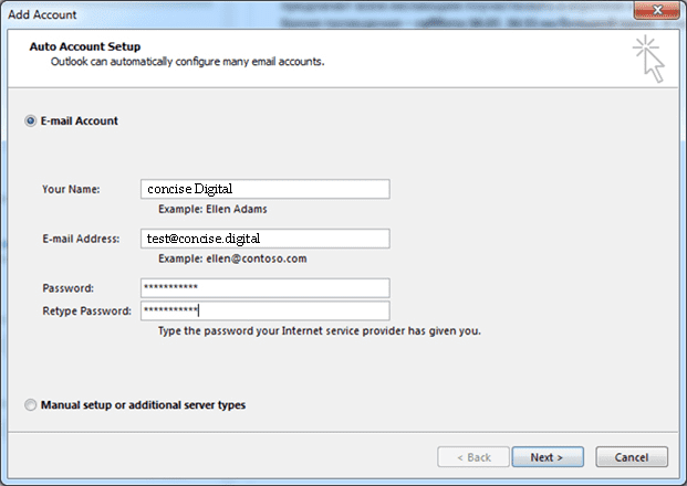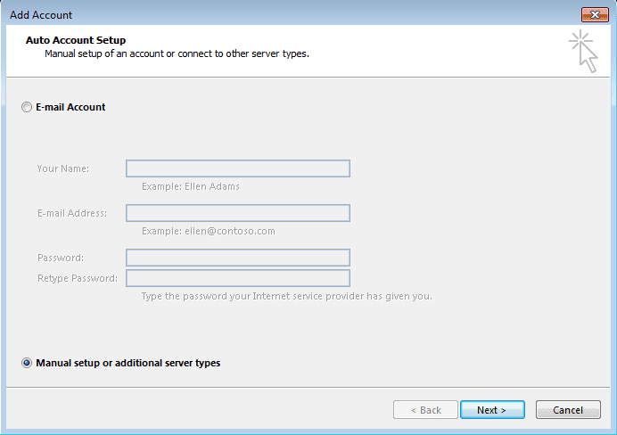 In order to set up your email account in Outlook manually, complete the first step which is described above and then follow the instructions below: