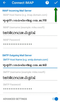 – IMAP Host Name: ‘the name of the server your account is hosted on’:993 (e.g. vpsp09.concisehosting.com.au:993) for SSL (or ‘the name of the server your account is hosted on’:143 for TLS/STARTTLS);