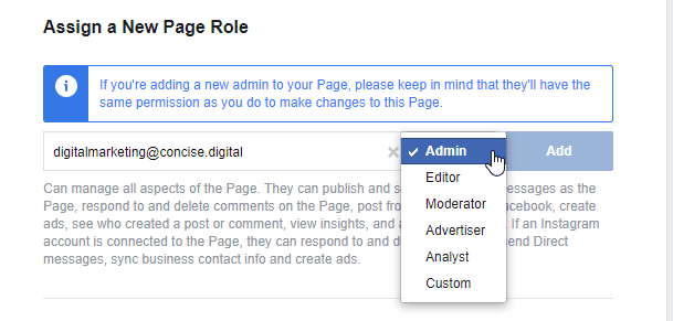 Step 5 – In the selection labelled “Assign a New Page Role”, enter our email address [email protected] and select “Admin” as the role.