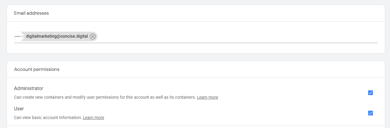 Our digital marketing team will get notified by email that you have added us to your Google Tag Manager account. If you run into any issues, please get in contact with us.