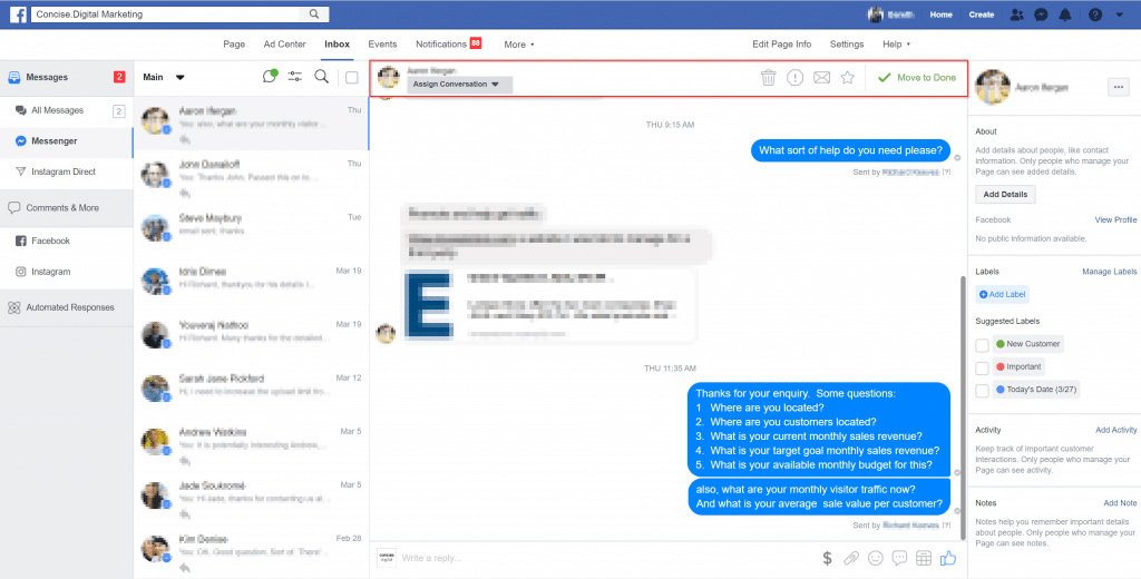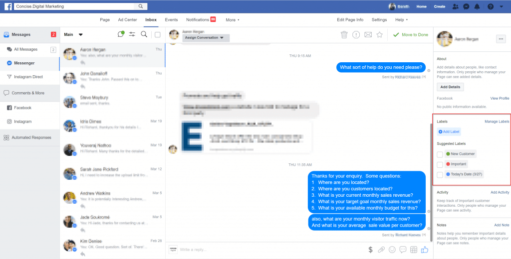 If you want to use Facebook Messenger as a simple CRM, the activity and notes section is really handy.