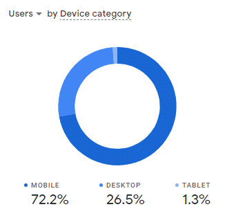 Device Report shows the percentages of users on either Mobile, Tablet or Desktop devices. Analysis of which device users have can be added as a secondary dimension to other reports so you can assess results by device.